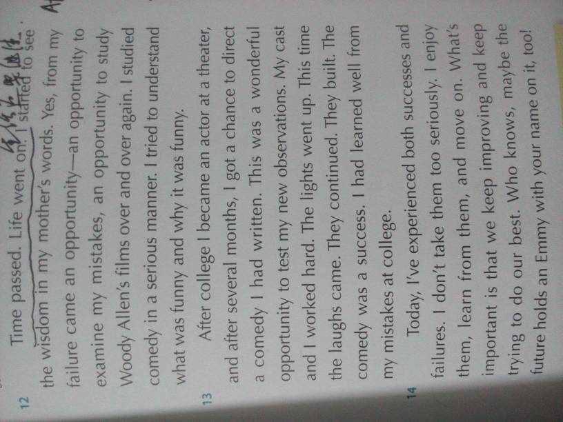 时间飞逝,我的生活也在继续。我开始觉得妈妈的话真的很有智慧。是的,我的失败其实是一个机会,迷葵饥一个能检验我所犯错误的机会,一个我能反反复复学习伍迪艾伦电影的机会。我曾特别严肃的学习喜剧,我也曾特别努力想了解那里面什么有趣,为什么有趣。 大学毕业之后我成为了一个戏剧演员,几个月之后,我有机会指导拍摄竖孟我编写的喜剧。这是一次很好的机会,来检验我的新见解。我的演员们还有我都很努力工作。然后拍摄用的灯光灭了(意思是我们拍完了),这次笑声也来了(意思是我的电影很有意思)他们继续表演,继续努力,这部喜剧取得了巨大成功,我从我在大学里犯过的错误中学到了很多。 到现在,我取得成功,也经历失败。但是我都不怎么在乎它们,我享受这个过程,我从中学习,然后继续生活。我们一直在提升自己,努力做到最好,这才是最重要的。天知道,也许艾它呈美奖上还有刻上你名字的时候。(艾美奖是美国一个著名的奖项,主要在电视剧上面)