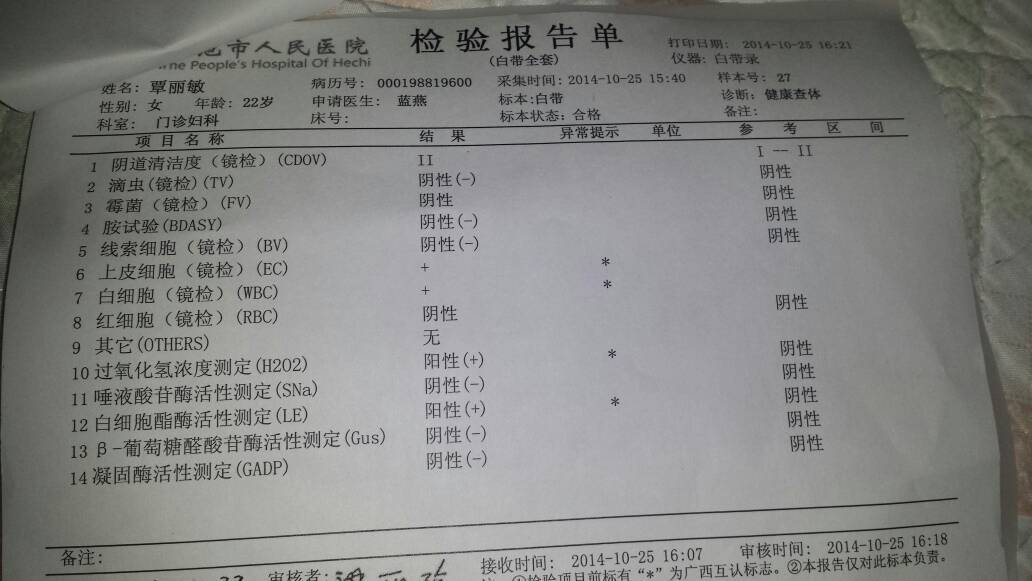 这是我的白带检查结果,请各位看懂的宝妈帮我看看 这是我的白带检查结果,请各位看懂的宝妈帮我看看 点击展开 187*****896_3jRU 2014-10-27 22:34 为您推荐: 其他回答 你好,根据你提供单子开始是有点轻度阴道炎的症状,建议用洁尔阴冲洗,平时注意个人卫生,勤换内裤 天使7737 2014-10-28 16:51 医生给开的没事 。。。敏。。。 2014-10-27 22:54 看着有几个不达标医生给开药了吧! 。。。敏。。。 2014-10-27 22:52 正常的讷。 后知后觉~已晚 2014-10-27 22:49 那就表示问题不大!没什么!自己注意点!勤换内裤~就好了~ 小傻瓜_DDsr 2014-10-27 22:42 加载更多 相关问题 今天查了个白带,有能看懂的宝妈吗 急!请帮我看看白带常规检查结果是什么病?严重吗?该怎样治疗?