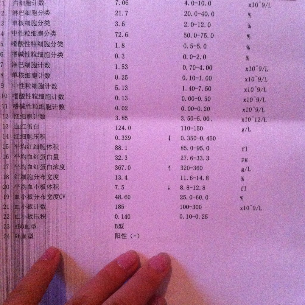这数据正常不 大家帮忙看看 这数据正常不 大家帮忙看看 点击展开 1610278621abc 2014-07-04 18:20 为您推荐: 其他回答 放心吧,这张检查没问题,实在不放心可以隔段时间去检查。 wmt0901 2014-07-10 19:15 你好,很正常,不用担心,这几个带箭头的指标是接近参考值范围,并不能算异常,每个人都有个体差异,这几个指标没有问题,也没有特殊的意义,大可以放心。 wmt0901 2014-07-04 18:39 相关问题 怀孕36w+2天的彩超数据,大家帮忙看看 大家好我怀孕25周了,请大家帮忙看一下这些数据看看宝宝健康吗?bpd6 4,hc23,ac21,fl4 6,hl4 0,hr140