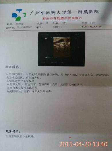 医生:你好!我儿子今年5岁9个岁,B超检查是幼儿精索鞘膜积液,请问最好是怎样冶疗? 医生:你好!我儿子今年5岁9个岁,B超检查是幼儿精索鞘膜积液,请问最好是怎样冶疗? 点击展开 冷暖@两心知*** 2015-05-03 14:25 为您推荐: 其他回答 你好,孩子已经将近6岁,自行吸收的可能较小。精索鞘膜积液治疗方法是手术治疗。 cn#BaukLaVVuL 2015-05-03 16:39 相关问题 我儿子今年三岁八个月,被诊断为精索鞘膜积液,说必须手术治疗,我想问一下有没有其他治疗方法? 大夫你好,我现在怀孕五十五天左右了,十天前去查做了B超,医生说宮腔内有少量积液,有可能引起先兆流产 你好 我今天去医院做妇科检查 做了B超 还有白带 医生就说我有盆腔炎和阴道炎 要做阴道