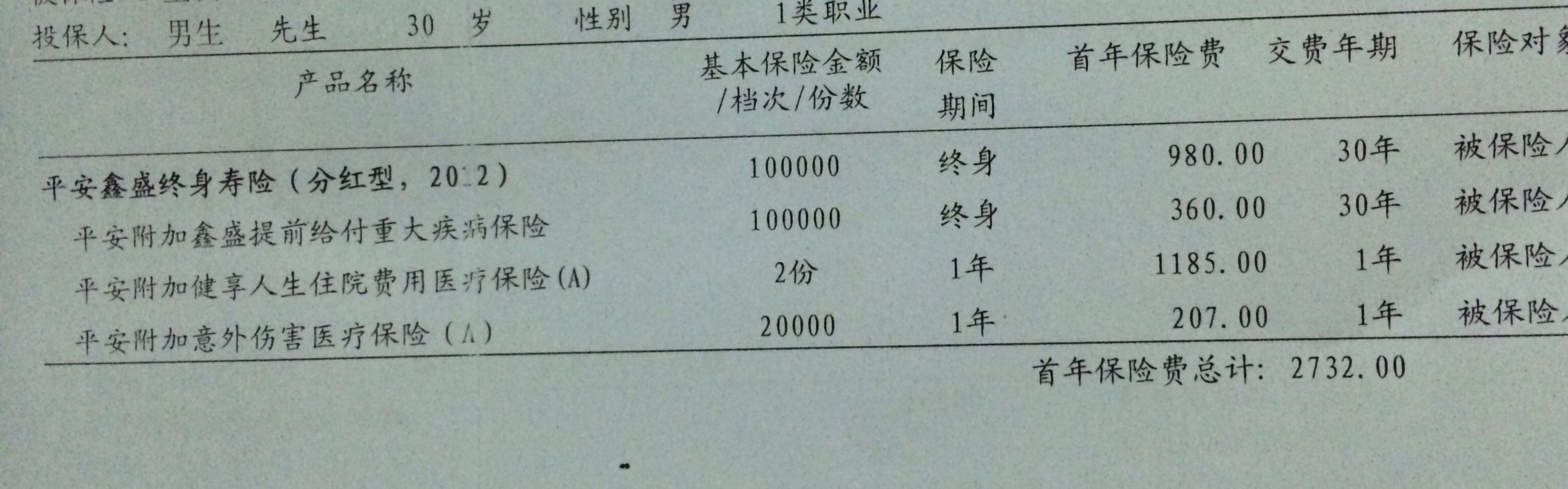 个人大致情况:30岁,年到手20w左右,宝宝今年出生。附图是我准备给自己和宝宝要买的两份保险。我自己那份平安福,最初的方案是主线和附加重疾保额都是30w,长期意外险50w,附加住院日额医疗保险10份,其他部分都一样,保费首年是9388,后来我又把主险和长期意外险保额提高到50w和80w,住院日额20份,保费就增加到14311。宝宝的保险,最初准备买教育金,后来想想教育金投资功能太弱,还不如买一份基金定投长期持有收益高,所以就只准备给宝宝买涵盖重疾、意外、住院方面的保险。请教各位大牛,这样一份计划书怎么样,或者有其他方案,也可以推荐,非常感谢!我只有值么多财富,全部赏了,不要嫌少。