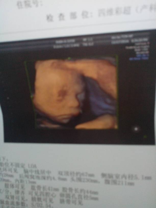 你好,四维彩超图中显示的是胎儿的面部和胎儿的腿,祝你生一个健康的宝宝。