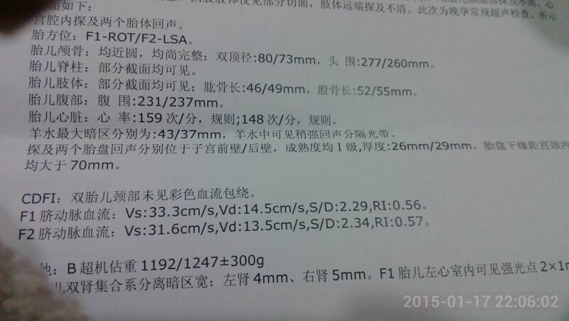 你好,看报告两个胎儿的胎心正常,羊水量正常,胎盘位置正常,建议后面要按时产检啊,