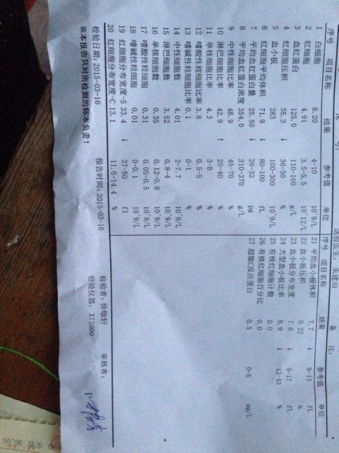 帮忙看下这张验血单,有的都低于参考值,需要补什么啊 帮忙看下这张验血单,有的都低于参考值,需要补什么啊 点击展开 ^_^飞★扬^_^ 2015-03-16 17:53 为您推荐: 其他回答 您好,血常规提示白细胞正常,淋巴细胞稍有升高,幅度不大,血红蛋白正常,血小板未见异常,至于其他出现的降低情况,问题不大,不用担心,总体来说,您的检查结果是算健康的。 ® 2015-03-16 18:00 看不懂问医生啊 贝_shJq 2015-03-16 17:54 相关问题 验血测孕+帮我看下是否怀孕不会看化验单+参考值和结果都 验血HCG结果里面显示15 09,参考值为0 46~10 00是代表什么 来月经的第一天小腹疼痛,去医院验血,hcg1 2miu/ml,参考值0-0 5,一个医生说没怀,一