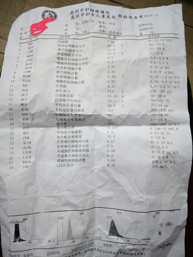 宝宝最近肠炎不能吃肉!每天吃白粥!牛奶也是减少到1天2次!接着又喉咙支气管炎,发烧了两次!病了将近一个月!检查血常规医生说贫血!怕是地中海贫血!下面有4号和9号的血常规报告!好心人帮我看一下!是不是地中海贫血!