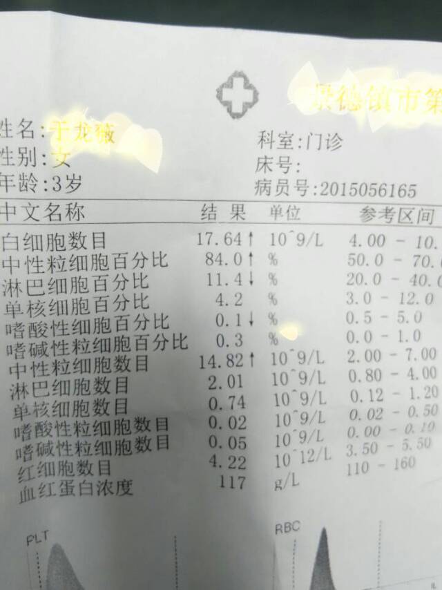 帮忙看下宝宝的这个化验单除了白细胞高外还有其他病症吗?早上吐了两次,流鼻涕,发烧,心跳快听呼吸肺里 帮忙看下宝宝的这个化验单除了白细胞高外还有其他病症吗?早上吐了两次,流鼻涕,发烧,心跳快听呼吸肺里有痰样,这样不会引起其他病症吧?现在特别担心!还有饮食方面怎么做好! 点击展开 匿名用户 2015-05-26 11:57 推荐回答 说叹辨明孩子有炎症。 措用愚施是消炎。 除了遵医嘱的用药之外,在家可以采用物理降温哑训破的办法给孩子降提问。 匿名用户 2015-05-26 12:14 宝宝知道提示您:回答为网友贡献,仅供参考。 为您推荐: 其他回答 没事 匿名用户 2015-05-26 12:10 相关问题 12个月小孩心跳加快呼吸不畅咳嗽白细胞高是什么问题 肺炎,呼吸管痉挛,心跳太快,小孩子 肺炎,呼吸管痉挛,心跳太快,小孩子