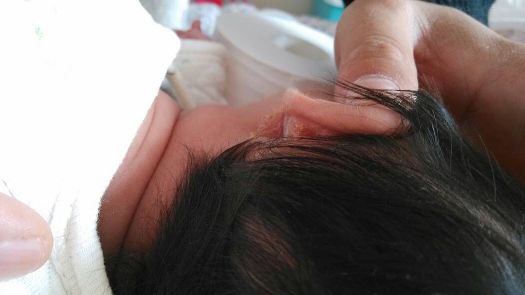 刚刚发现我家小宝耳朵后面烂了!都流脓水并结痂了!昨天洗澡都没发现!亲们知道是怎么回事吗?