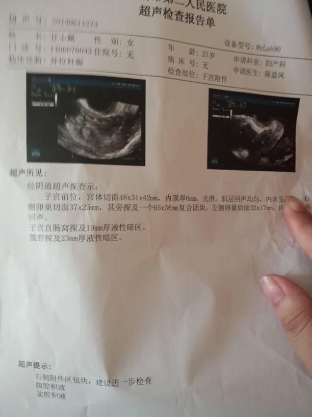 请问我这是宫外孕吗?求你们帮忙回答回答,我好害怕 请问我这是宫外孕吗?求你们帮忙回答回答,我好害怕 点击展开 好想做妈妈 2014-06-11 15:22 为您推荐: 其他回答 不用谢。建议您先观察,如有加重建议去医院详细检查。 高进free 2014-06-11 16:37 你腹部疼么,没有看见孕囊 梦一场 2014-06-11 15:55 应该是宫外孕了,听听医生怎么说。 醉清风non 2014-06-11 15:34 这情况还是慎重较好的,考虑积极选择淡盐水清洗的,考虑注意卫生,经期不规律建议选择内分泌情况检查一下再考虑用药的 高进free 2014-06-11 15:23 相关问题 我怀孕49天了,请时常会肚子疼,除了会是宫外孕还有其他原因吗,好害怕 我吃了毓婷后五天来月经了 怎么办?不会有什么问题吧!宫外孕?还是怎么了?好害怕!