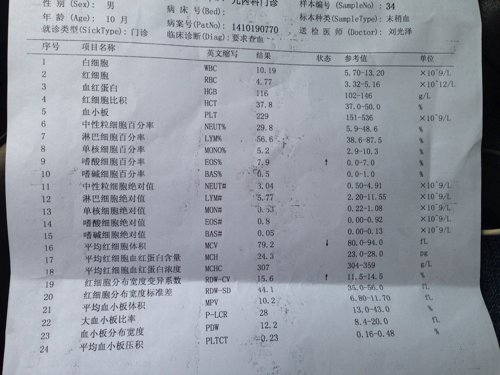 小孩10个月了,肚子上和背腰起红点,有点像鸡皮疙瘩的形式,在医院查血嗜酸细胞偏高,还有2样有出入 小孩10个月了,肚子上和背腰起红点,有点像鸡皮疙瘩的形式,在医院查血嗜酸细胞偏高,还有2样有出入,专家帮忙看看吧,偏桃体二度,咽大充血,但是又没有咳嗽发烧,不知道什么情况 点击展开 匿名用户 2014-10-20 12:55 为您推荐: 其他回答 指导意见,你好,孩子现在这个i情况是有过瘾,考虑是过敏引起,建议多听取医生的意见,在专业医生的指导下进行治疗 野鸭子7205 2014-10-25 15:18 相关问题 宝宝前胸后背起了一大片像鸡皮疙瘩一样的小疙瘩是什么呀,不疼不痒不红,宝宝前一段时间发烧拉肚子经治疗 2岁小孩身上有藓,请帮忙看下这是什么?看着挺吓人的,起鸡皮疙瘩一样 我的小孩发烧39度,给她吃了阿奇霉素和布洛芬,次日出了许多象鸡皮疙瘩一样的小点点今天更多了,请朋友帮个忙