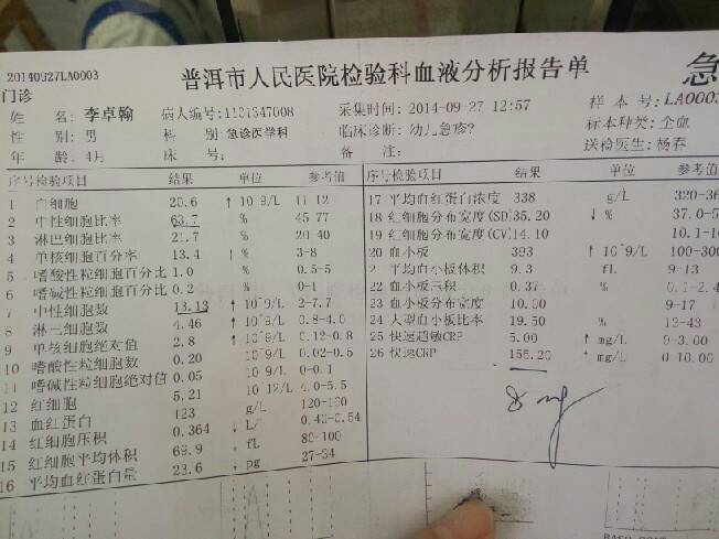 麻烦帮看下,这个血液分析 麻烦帮看下,这个血液分析 点击展开 追忆_dbjj 2014-09-27 17:55 为您推荐: 其他回答 CRP是急性炎症的一个指标,有时候也不只是看孩子的精神状态的,反过来说,如果不放心的话可以再复查一下,有时候测量是有误差的,一般扎个手指头就可以了。 小五音不全郎 2014-09-27 22:39 这个结果提示宝宝的感染比较严重,CRP太高了,建议还是住院治疗! 匿名用户 2014-09-27 20:47 相关问题 请帮我分析一下5岁小孩的血液检查 三个月产检血液化验单,麻烦懂的帮忙看看正常吗? 麻烦医生看下,我家孩子四个多月,感冒咳嗽,这是血液检查,有