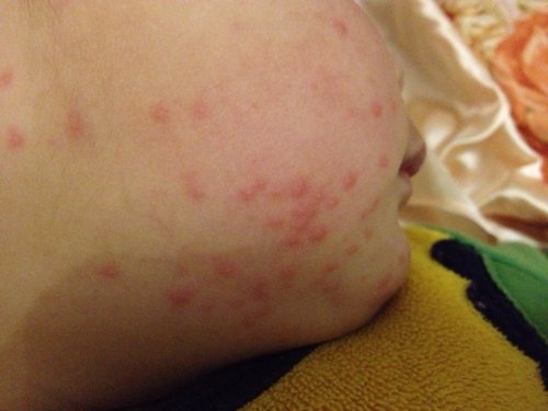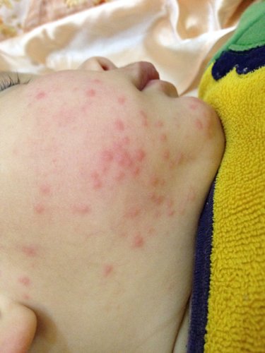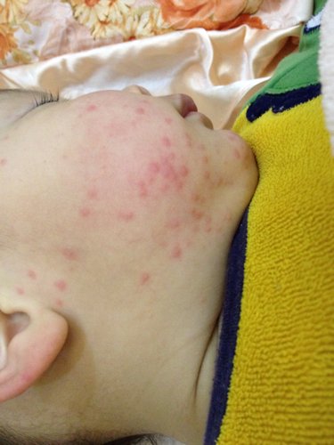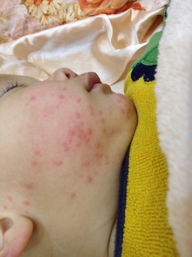你们好,请问宝宝一周五今天早上突然脸上长了这些疙瘩 洗澡后更严重些 这里天气这几天都起大雾 怀疑湿