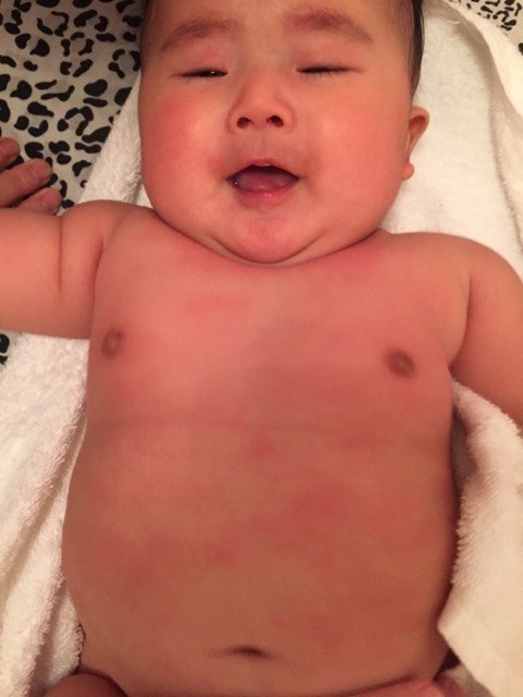 谁帮我看看,孩子是不是过敏啊!打了百白破就这样了,一片片红,洗完澡就这样,不热的时候还没有