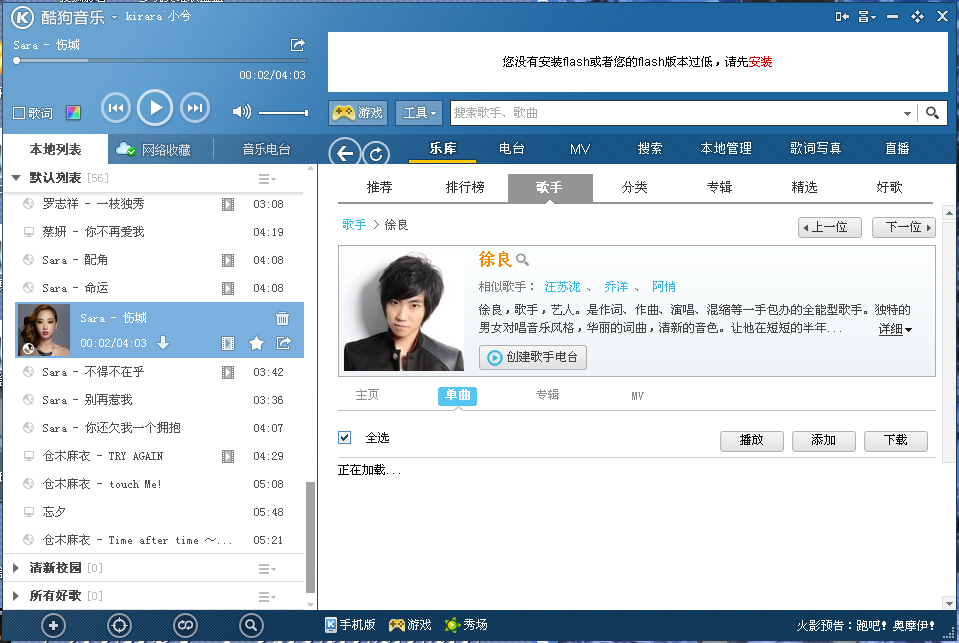 求高手帮忙我的酷狗来大姨妈了 我的酷狗点开乐库里单曲播放从昨天开始就点不开了上面显示未安装flash或版本过低我去360里面下载了flash最新版本可还是这样有没高手帮忙下 点击展开 匿名用户 2013-06-30 13:12 为您推荐: 其他回答 那好啦就好呀 匿名用户 2013-07-02 16:57 不是下载吧。更新一下就好了 匿名用户 2013-06-30 19:37 相关问题 2013年欧美酷狗mv关于小男孩女孩的视频 谁有好的儿歌,童谣?酷狗不是有吗,我的儿童都是那里下的 在哪可以下载到儿歌呢?可以到酷狗里面去看看,很多的