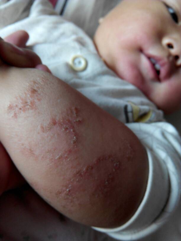 我家宝贝现在湿疹胳膊,腿上都有,症状为皮肤变厚,干燥,粗糙的痂皮,痒的她老去用手抓,有时候睡觉都烦