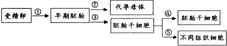 A、 ①是早期胚胎培养过程,不需要用超数排卵技术,故A错误;B、 ③是从早期胚胎中获取胚胎干细胞的过程,可以用胰蛋白酶处理囊胚获得干细胞,故B错误;C、 ④表示胚胎干细胞培养,需要无菌无毒的条件,故C正确;D、 ⑤表示胚胎干细胞分化形成不同组织细胞的过程,该过程可以直接获得T淋巴细胞,形成效应细胞毒...