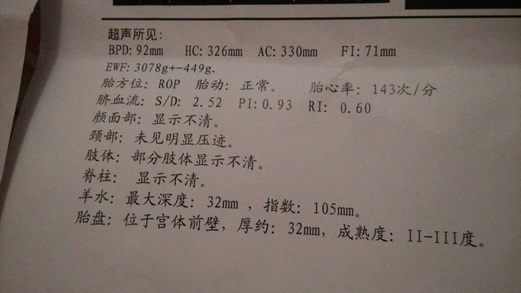 你好,您这个应该就是普通的二维彩超吧,可能是英伟孕晚期的原因,宝宝的脊柱显示不清,看宝宝的大小你或者就快足月了吧,宝宝的胎心正常,没有脐绕颈,羊水也在正常范围。祝你生一个健康可爱的宝宝。