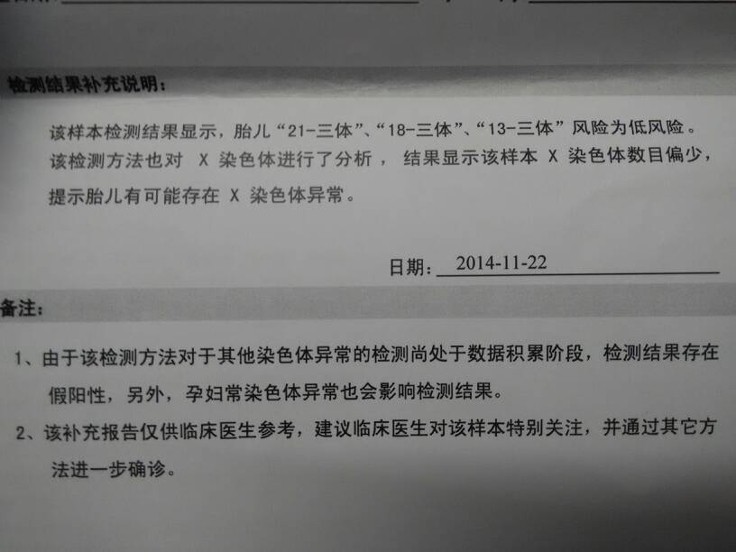 有医生在吗?请问胎儿检查出来染色体X的数目偏少,提示胎儿有可能存在X染色体异常是什么意思啊? 有医生在吗?请问胎儿检查出来染色体X的数目偏少,提示胎儿有可能存在X染色体异常是什么意思啊? 点击展开 宝宝猪 2014-11-27 21:49 为您推荐: 其他回答 祝宝妈好孕 蓝色妖姬_lNSK 2014-11-29 21:15 建议去医院看一下了 本宫不死,你们终究是妃。 2014-11-29 12:39 你好,从你提供的检查结果上看,胎儿的染色体与正常人不一样,有可能会有染色体疾病 羽化翩跹lc 2014-11-28 20:59 去问问医生吧 ~~_qdAD 2014-11-28 14:29 祝宝妈好孕 婷儿护肤品 2014-11-28 14:07 加载更多 相关问题 X号染色体数目偏少,提示胎儿有可能存在X染色体异常必须做羊水穿刺吗? 做唐氏综合结果是高风险,医生建议我去个染色体检查,染色体检查是检查什么啊? 我是染色体异常,前面流产两次,医生说要做第三代试管,但是我还是想堵一次,我现在自然怀孕,我应该怎么
