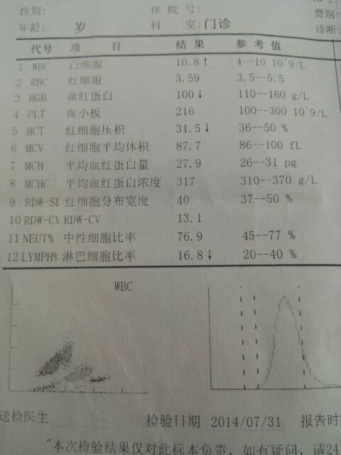 孕34+1,抽血检查的报告单,有什么问题不?或者需要注意什么?谢谢 孕34+1,抽血检查的报告单,有什么问题不?或者需要注意什么?谢谢 点击展开 雨梦☆牵依 2014-08-01 10:44 为您推荐: 其他回答 没有什么特别的问题,可以多吃点瘦肉菠菜这类补血的,血红蛋白在孕妇正常值的最低点。 brittany1022 2014-08-01 10:46 相关问题 第一次孕检就是做B超 验血吗 抽血检查什么啊 用不用空腹啊 我孕7周照b超2次了,都因为每两天有点血,那种褐色死血分泌物,检查抽血,B超一切正常,医生就开3天 现在孕5个月,抽血检查说我贫血,我现在可以吃什么补血?