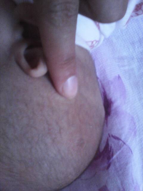 有医生在吗???我儿子头上耳朵后面有个包包…两边都有!!在我手指的地方请问这是什么??