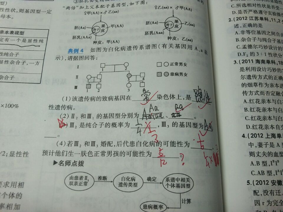 第三代2号虏吴怨的基因型是1/3AA和2/3Aa,而3号的基因型就是Aa, 所以他们后代患白色病的概率是2/3*1/4=1/6, 后代肤色正常的概率是1-1/6=5/6, 后代肤色正常则瓣的孩子中,男孩半破占1/2, 所以后代肤色正常男孩的概率是5/12。