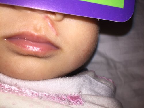 我的宝宝三个月大 半个月前从床上跌落,人中旁的部位被柜子角滑破,没有缝针,就上了一点胶 现在伤口