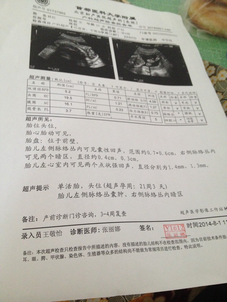 今天做的21周B超结果看不懂阿有知道告诉下怎么回事吗 今天做的21周B超结果看不懂阿有知道告诉下怎么回事吗 点击展开 大宝妈妈 2014-08-01 13:41 为您推荐: 其他回答 不客气 希望帮得上你 羊爆丝 2014-08-01 13:46 还有股骨长的 你看看咯 羊爆丝 2014-08-01 13:45 我有一个双顶径的参数值 你可以看看 其他的你可以百度下 或许会有类似的参数值表 羊爆丝 2014-08-01 13:44 相关问题 怀孕7周,这是今天上午的B超结果,谁能帮忙解释下,这结果正常吗? 我想请问一下医生,我是六周的时候照了一个B超胎心胎芽都有了说是正常,今天是8+3周好担心会不会胎停 今天去医院产检,本来说要做b超,但因为过三周要做b超和抽血检查,医生就让我听一下胎心,听着宝宝的心