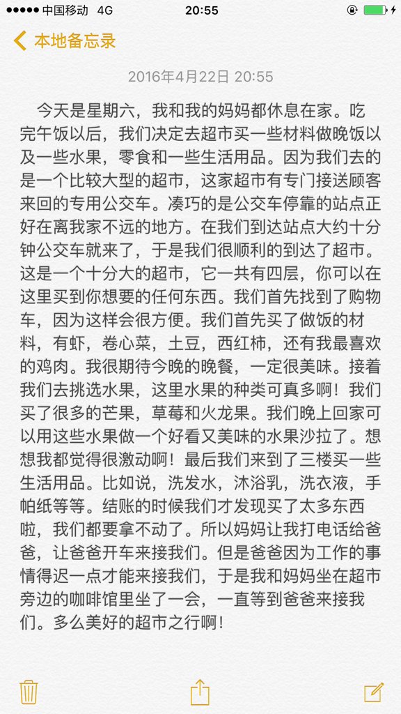 Aujourd'hui, nous sommes le samedi, ma mère et moi sommes toutes les deux au repos à la maison. Après avoir fini le déjeuner, nous avons décidé d'aller au supermarché pour y acheter les ingrédients pour faire le dîner ainsi que des fruits, des collations et des articles d'usage courant. En raison du fait que l'on a choisi d'aller dans un supermarché d'une taille supérieur, ce supermarché possède une navette spécialisée dans le transport des clients d'un certain arrêt au supermarché. Comme par hasard, l'endroit où s'arrête le bus est l'arrêt de bus qui se situe pas loin de chez moi. Lorsque nous sommes arrivé(e)s au terminus, le bus est arrivé dans environ 10 minutes. Par conséquent, nous sommes arrivé(e)s sans problème au supermarché. Il s'agit d'un très grand supermarché, comportant quatre étages, où vous pouvez acheter tout ce dont vous avez besoin. Nous sommes, d'abord, allé(e)s chercher un caddie, parce que comme ça, ça va être plus pratique. Nous avons d'abord acheté les ingrédients pour faire à manger, il y avait des crevettes, du chou, des pommes de terre, des tomates et du poulet que j'aime. J'avais vraiment hâte du dîner de ce soir, qui promet d'être delicieux. Ensuite, nous sommes allé(e)s choisir les fruits, les genres de fruits ici sont vraiment nombreux! Nous avons acheté beaucoup de mangues, de fraises et de fruits de dragon. On pourra, en rentrant, faire avec ces fruits, une belle et délicieuse salade de fruits pour ce soir. Rien qu'en y pensant, ça m'excite. Enfin, nous sommes allé(e)s au troisième étage acheter des articles d'usage courant, par exemple, des shampooings, des gels douches, de la lessive, des mouchoirs, etc. Lorsque nous sommes passé(e)s à la caisse, nous avons remarqué que l'on avait trop acheté, il nous était impossible de tout ramener à la maison. Donc, ma maman m'a demandé de telephoner à mon papa, pour qu'il prenne la voiture et vienne nous chercher. Mais comme mon père à cause du travail doit venir nous chercher un peu plus tard