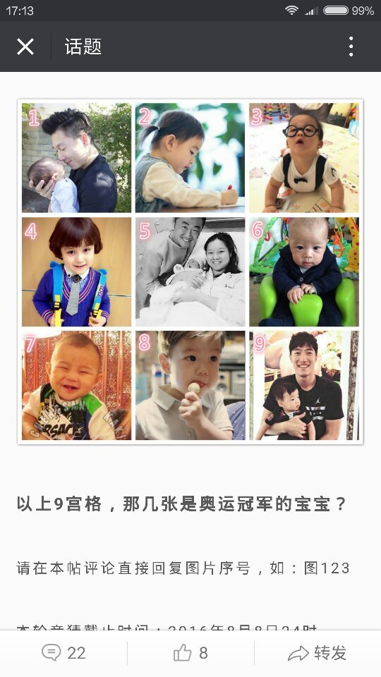 这几个图片哪几个是奥运冠军的宝宝?第五个是不是啊? 点击展开 150*****315_wRoD 2016-08-07 09:32 为您推荐: 其他回答 2.5.8 匿名用户 2016-08-09 08:21 第五个是绝对是 匿名用户 2016-08-09 00:09 第一个是奥莉,李小鹏的女儿 匿名用户 2016-08-08 22:00 我可以确定第五个是,他是哪个网球冠军李娜的孩子 匿名用户 2016-08-07 10:18 相关问题 小孩现在跑的快,长大能当奥运冠军吗? 奥运冠军刘璇的孩子也是用的帮宝适拉拉裤? 私人飞机落在荒岛上,他们其中有科学家,企业家,奥运冠军,孕妇,宇航员和流浪汉