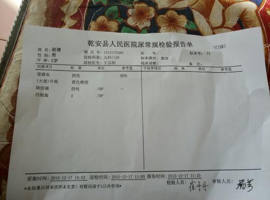 很急,孩子两岁,不停的腹泻还伴有肚子疼,化验结果如图,求帮助,该怎么办? 点击展开 1107558284 2015-12-17 11:56 满意回答 您好,很高兴为掏暖您解答,怠悼稼从化验结果看,不是太大问题,还是急性胃肠炎症状。如果能婚局喝进水,那就多喝水,只要不脱水,就没太大问题。 cn#BppLupaBBG 2015-12-17 12:01 宝宝知道提示您:回答为网友贡献,仅供参考。 相关问题 24小时内吃了避孕药,吃了避孕药后就肚子疼腹泻,为什么几天后我感觉肚子有点痛乳房也有点痒,可月经期 12周做完b超,显示11周头臀5 1cm!第二天胃疼的厉害,后来肚子疼腹泻!第三天不拉肚子了,但是 吃了酸奶和木瓜肚子疼、胃疼、腹泻,怎么办