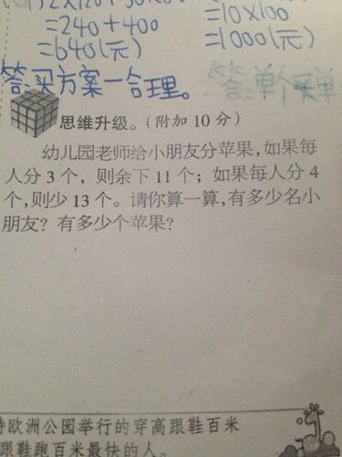 幼儿园老师给小朋友分苹果、如果每人分3个,则余下11个,如果每人分4个、则少13个 请你算一算,有