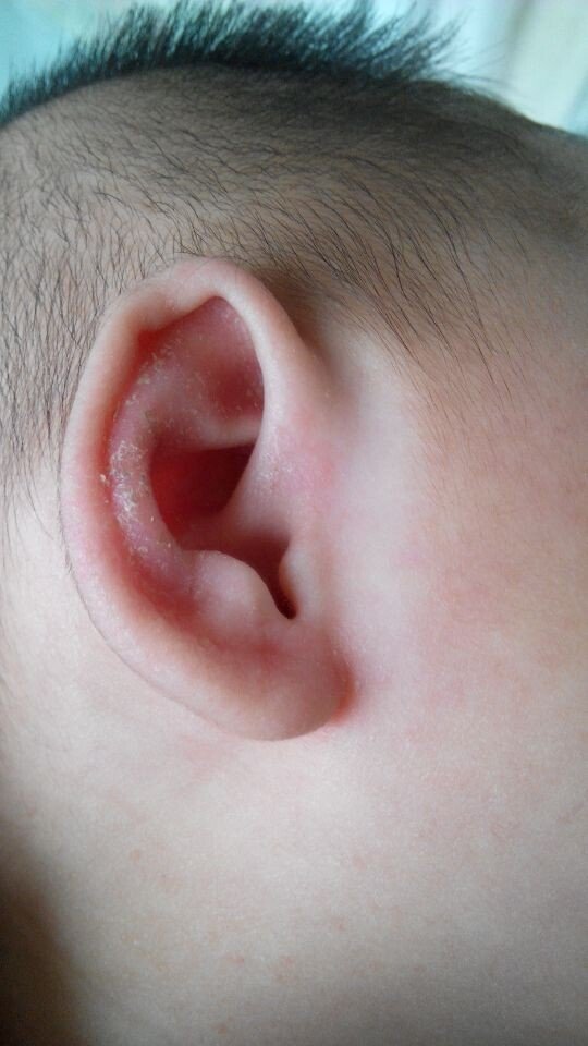 宝宝三个半月,耳朵一直痒,之前是一直脱干皮,已经快一个月了,最近一个星期开始结痂后蜕皮