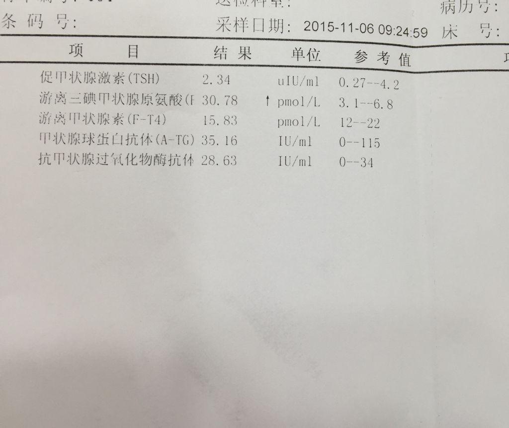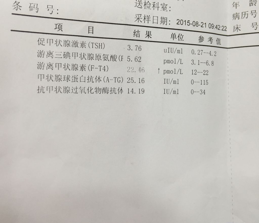 孕前体检,甲状腺T4偏高0.46,T3在正常值内,孕后检查,T4正常,T3超标23.98,这是什么 孕前体检,甲状腺T4偏高0.46,T3在正常值内,孕后检查,T4正常,T3超标23.98,这是什么原因,严重吗? 点击展开 匿名用户 2015-11-06 19:45 满意回答 您好,根据您的描间耀述。你搁肿医应该是患有甲亢了。建议你一周后复查。如果持续瓦征增高的话那就用药了。 cn#BBaQLfGQGk 2015-11-06 19:50 宝宝知道提示您:回答为网友贡献,仅供参考。 相关问题 甲状腺检查结果是T3、T4正常,TSH偏高于正常值,抗体检… 请问:甲状腺血检(T3.T4等项目)是否一定要空腹… 双侧甲状腺肿大T3T4TSH正常