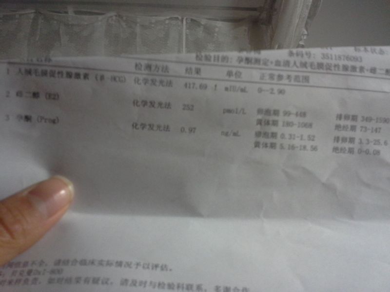怀孕50天了,流血,孕酮低只有0.97ng/ml,人绒毛膜激素只有417.69mlu/ml,e2只 有252 点击展开 134*****821_13CF 2015-02-10 18:15 为您推荐: 其他回答 这种情况要么是宫外孕,要么是流产了。你要追踪HCG,如果持续升高,可能是宫外孕。 cn#BLkVkBkVaG 2015-02-10 21:24 相关问题 9月29日末次月经,绒毛膜促性激素70 8IU/L,孕酮38 64ng/ml,正常吗? 引产一年多后有溢乳并有轻微胀痛,做乳腺b超正常,性激素六项E2:247 71pg/ml FSH 怀孕50天了,流血,孕酮低只有0 97ng/ml,人绒毛膜激素只有417 69mlu/ml,e2只