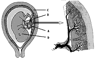 下图是胎儿发育期间营养供应的相关结构图,据图回答下列问题。 (1)请标出B和C的名称:[B]__________ [C]__________ (2)受精卵分裂和胚胎发育初期的营养由_________提供。(3)胚胎植入子宫内壁后,在胚胎与子宫壁接触的部分形成[A]_________。(4)胎儿通过[A]和[B],从母体内获得_______________,并将代谢产生的________气体和其他废物排入母体的血液,由母体排出。