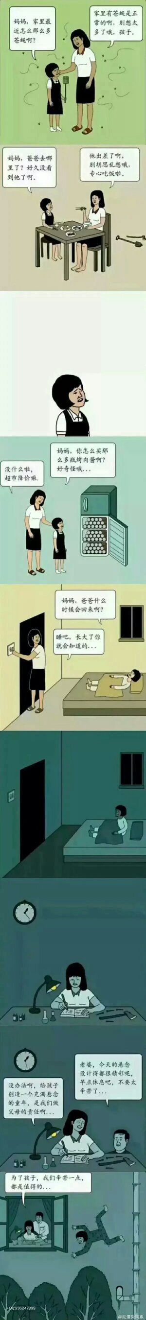 复制的 有没有发现一个问题,为什么小女孩整天只穿着袜子而没穿鞋子,从服装看这个背景是夏天,大夏天的为什么小女孩在家里要穿袜子,大家再看,她睡觉时明明把袜子脱了,而最后一幅图袜子又出现了,她为什么至始至终都没有穿鞋?我们不妨做个大胆的推测,小女孩根本没有鞋子,那为什么没有鞋子呢,原因很简单,因为这根本不是他们的家,他们是紧急临时逃过来的,鞋子可能在逃跑时掉落了,根本没时间买,从第一幅图就可以看出来了,小女孩问家里为什么有那么多苍蝇,说明以前根本没有苍蝇,大夏天一楼肯定有苍蝇了,说明他们以前不是住这里的。再看小女孩的卧室,除了床和被单根本没有任何家具,一般小女孩家里都会挂一些偶像的照片和放一些娃娃之类的。他们为什么会无缘无故逃亡到这里,这个暂且不说,看第二幅图小女孩一坐下来就问爸爸去哪了,连筷顿剩子都没拿起来,说明不是她吃饭时随便问的,而是早就想问了,而小女孩刚问完妈妈就拿筷子指着她,示意她不要问了,看妈妈椅子后面还有钉子和锤子,为什么钉子和锤子会随便扔在地上,就不怕踩到人吗,为什么小女孩看不到地上的东西,还一个劲的问爸爸去哪了,答案可想而知,小女孩假装不知道,想旁敲侧击的验证自己心中的想法(爸爸死了)。看下面那副小女孩思考的图就知道她早就想到了很多。小女孩看到冰箱的肉就明白了一切,可是还是要假装不知道,临睡觉前都要问一下爸爸去哪了,这个看起来有点多余,但这就是小女孩高明之处,她表现得像一个普通的小女孩一样。妈妈关完灯之后小女孩就立刻坐了起来,像是要有所行动了,她要印证自己的想法,顺便去查找证据。看倒数第三幅图,为什么钉子被摆在了桌上,时钟上都凌晨一点多了,她妈妈还在写什么东西,这是一个铺垫,在最后两幅图都说出来了。倒数第二幅的谈话就可以看出他们要给孩子一个悬念的童年,还设计了那么多东西,给谁的孩子,小女孩?当然不是,而是她和这个男人的孩子,妈妈是把自己的事写到了书上。在看最后一副图,为什么钉子不见了,为什么这么隐秘的事他们开着窗户,连窗帘都不拉,为什么最匪细男人大夏天的把自己之前穿着的外套披到了妈妈身上,把不可能的事情征阶排除之后,剩下的事情再怎么离谱,那就是真相。他们不开窗子就是为了让小女孩偷听,为了引起小女孩的注意之前还做了那么多事,比如地上的锤子,冰箱的肉和妈妈的反常。这就可以解释男人为什么夏天穿一件黑色的外套和桌子上事先摆着的锤子,男人偷偷出去把小女孩杀了并钉在墙上。男人为什么后面把衣服披到了妈妈身上也可以解释了,毕竟他们亲手杀死了她的孩子,妈妈当然会起鸡皮疙瘩。最后说一下为什么男人把女孩钉到了墙上,因为这不是他的亲身骨肉,男人想要体验一番把另外一个男人和自己心爱的女人的结晶射在墙上的感觉