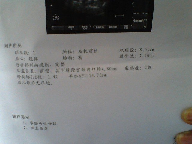 怀孕39周,双顶径:8.56cm,股骨长:7.40cm 正常吗?会不会畸形? 今天39周零1天,做彩超的时候大夫说胎儿的头偏小,是扁的,椭圆的,请问大夫,有没有畸形的可能?孩子会不会很丑? 点击展开 荤问风_lOO8 2014-04-06 16:14 为您推荐: 其他回答 病情分析: 正常的,这时胎儿的肺部和消化系统已经基本发育完成了, 指导意见: 双顶径大约80~87mm,股股长大约55~65mm属于正常值… 赫亦凝_2Vv0 2014-04-06 17:32 相关问题 现在怀孕27周了检查胎儿双顶径6 39股骨长为5 0请问胎儿发育的小吗 怀孕39周检查羊水偏少,顺产有影响吗 我怀孕自己算34+6天今天做 b超显示35周加,我宝宝会提前生吗?还有宫壁厚39呈‖级是什么?