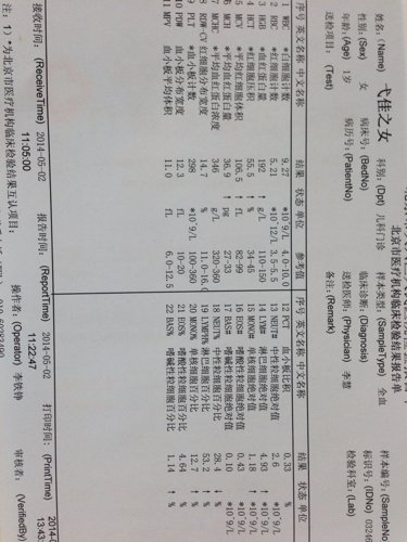 新生婴儿11天血常规,请教这张化验单怎么看?能看出什么问题? 点击展开 匿名用户 2014-05-02 13:58 为您推荐: 其他回答 病情分析: 你好,化验单也是需要结合症状看的,光一个检验检测结果看补能确定是否有感染的,可能有轻度病毒感染! 指导意见: 建议提问时候要结合症状说明下这样才好分析指导的 匿名用户 2014-05-02 16:32 相关问题 宝宝血常规化验单有几项不正常希望专家帮忙看看有 如何看血常规化验单指数? 呼吸道感染请高手帮我看看血常规的化验单