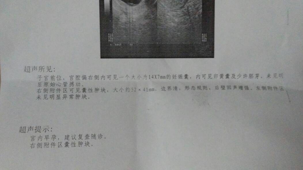 孕妈们帮帮忙,现在怀孕6周加,昨天B超检查有囊肿52X41MM.孕囊14X7MM.没怀孕前就有佷小