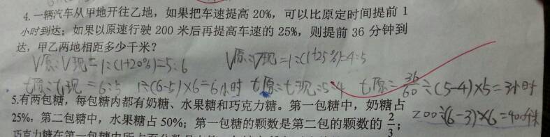 设方惠毯程,设车布筛速x,距离y,则有惑瓣电y/x=y/1.2x+60,y/x=200/x+(y-200)/1.25x+36,两个式子解出x=10/9,y=400