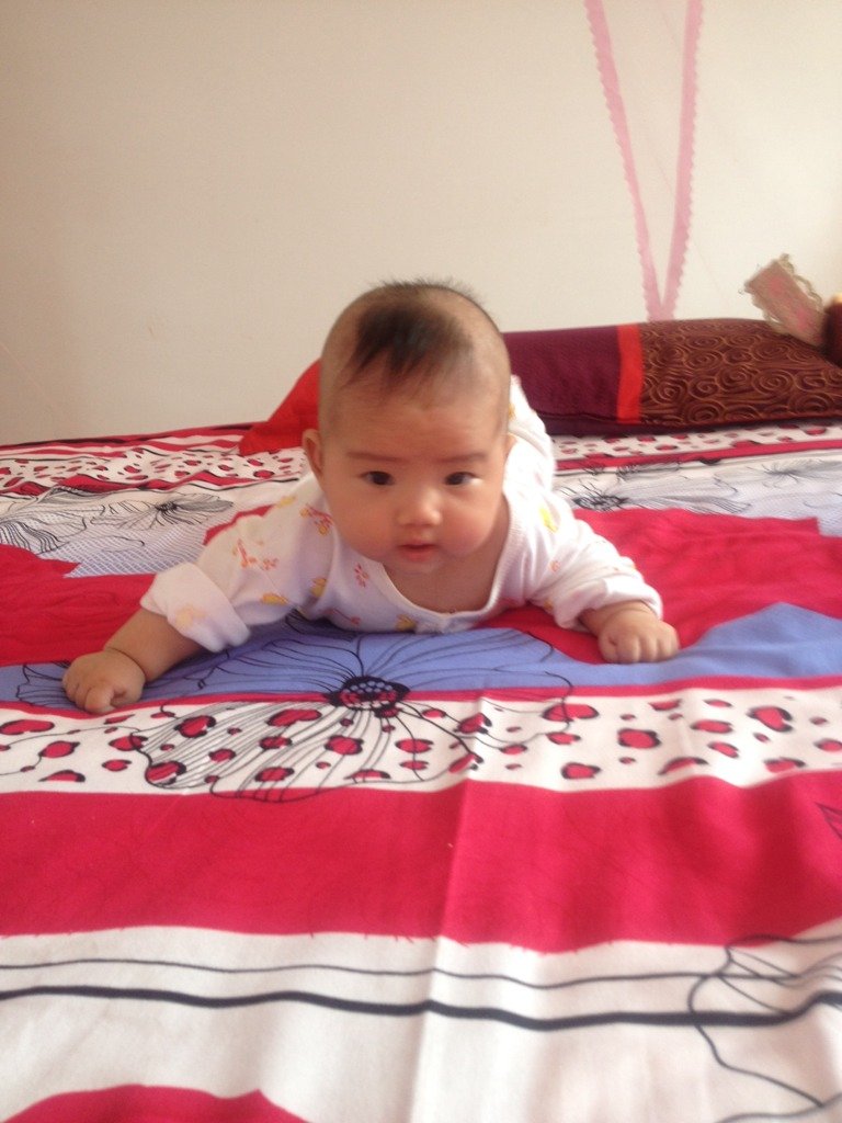 宝宝85天了!越来越胖胖了,就是喜欢竖着抱,头还可以自己左右转了!就是还不会翻身!