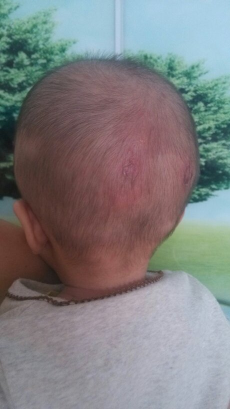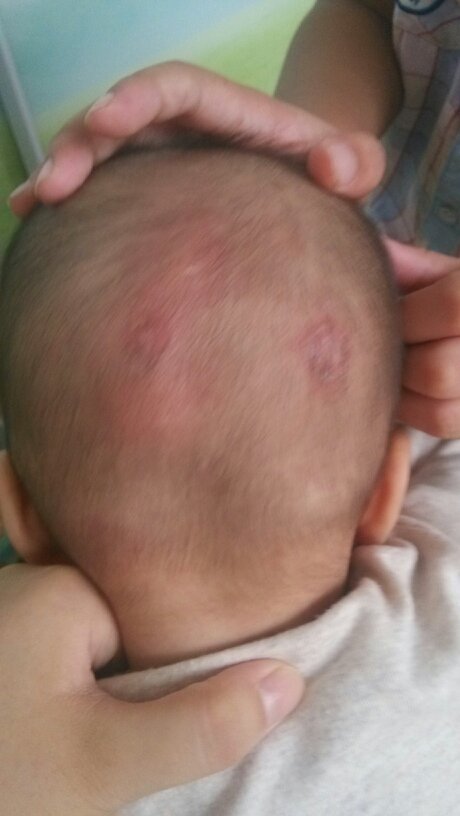 不要让宝宝用手抓, 用碘伏涂涂,消毒。 涂点红霉素软膏看看。 如果症状两天不见轻, 去医院处理下。 最近几乡过天不要再给宝宝洗头今糕截了, 其他地方用毛巾擦擦就可以了。 大人太密队粗心了, 看着让人心疼。