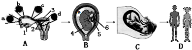 (1)图中A为排卵示意图;B示意子宫内的受精和胚泡发育;C示意胎儿分娩的大致过程;D示意青春期的发育.瓦厘 (2)图中序号所指结构名称:1卵巢、2子宫内膜、3子宫;4胎儿、5;脐带、6胎盘; (3)a表示受精,精子和卵细胞在输卵管中结合为受精卵.e中充满的液体是羊水,这是胎儿生活的环境. (4)蛇北胎儿生活在子宫内半透明的羊水中,通过胎盘、脐带从母体的血液里获得氧气和营养物质,同时把产生的二氧化碳等废物排到母体的血液里,再由母体排出体外. (5)青春期是人生的黄金时期,身体和心理都发生了很大变化.如身高和体重增加;变声;阴毛和腋毛;男孩出现遗精,女孩出现月经;性意识开始萌动;不想与家长、老师交流等. (6)胎儿在母体子宫内通过胎盘与脐带与母体进行物质交换,胎盘呈扁圆形,是胎儿和母体交换物质的器官,胎盘靠近胎儿的一面附有脐带,脐带与胎儿相连.胎盘靠近母体的一面与母体的子宫内膜相连,胎盘内有许多绒毛,绒毛内有毛细血管,这些毛细血管与脐带内的血管相通,绒毛与绒毛之间则充满了母体的血俗肿涉液,胎儿与母体通过胎盘上的绒毛进行物质交换.胎盘中有子体与母体各自独立的两个循环系统,绒毛可视作半透膜,当母体的血液在绒毛间隙以及子血在绒毛内流动的同时,即能进行物质交换.因此胎儿在母体内就已经开始工作的系统是循环系统.故答案为:(1)排卵、受精和胚泡发育;;;;;;胎儿分娩;(2)子宫;;;;;;脐带;;;;;;胎盘(3)输卵管;;;;;;羊水;;;;;;;;;(4)胎盘;;;;;;脐带(5)如身高和体重增加;变声;阴毛和腋毛;男孩出现遗精,女孩出现月经;性意识开始萌动;不想与家长、老师交流等(6)C