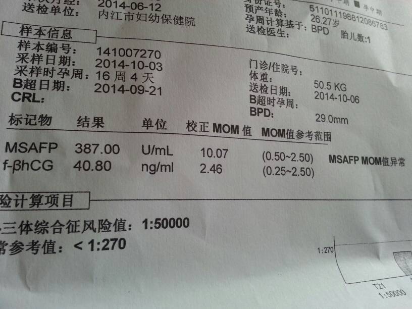 有医生帮我看下AFP为10.07属于唐氏高危我需要做羊水穿刺吗? 有医生帮我看下AFP为10.07属于唐氏高危我需要做羊水穿刺吗? 点击展开 丑小鸭_W3mH 2014-10-10 21:13 为您推荐: 其他回答 照做放心些 蒋依航 2014-10-13 10:13 看看醫生怎麽說 lu10355 2014-10-13 08:57 我弟媳也是一项高,医生也建议她做羊水穿刺,她都吓哭了 清眸拓墨 2014-10-12 19:46 12周做的是早唐哦。 清眸拓墨 2014-10-12 19:44 我的唐氏是正常的,但和你的表单不一样,你只要看它检查结果所显示的三项比例各是多少就行。 清眸拓墨 2014-10-12 19:44 加载更多 相关问题 我今年22岁,查出唐氏高危,AFP0 38,HCG5 68,高风险1/145是否要去做羊水穿刺 刚刚16周两天,做彩超胎儿左心室内可见一强回声光点,医生建议我不做唐筛,直接羊水穿刺,我想问问姐妹 昨天去做唐氏筛查,照彩超的时候医生说宝宝有双侧脉络膜丛囊肿,让我星期四去做羊水穿刺,想问一下双侧脉