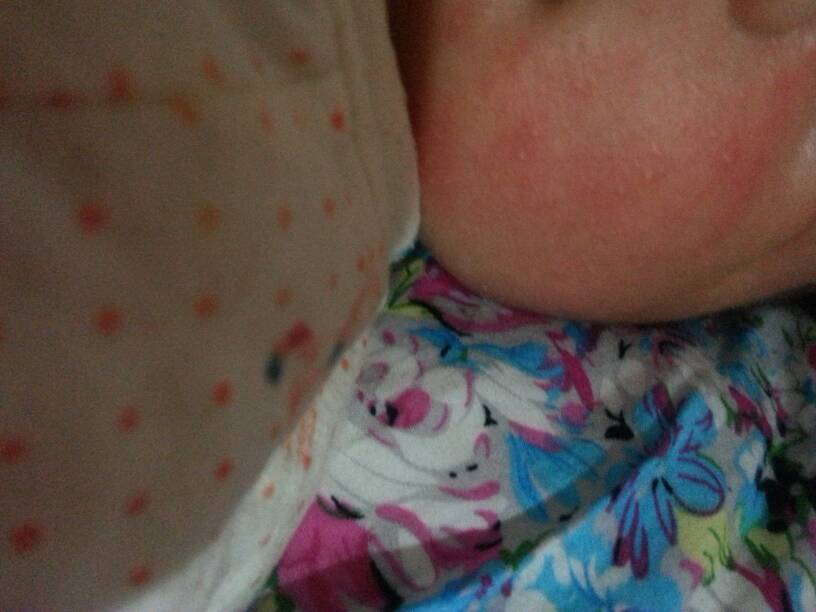 男宝宝22天,这几天脸上起了很多热疙瘩,家里一直开空调室温18-20度,宝宝在家里穿小薄棉袄,下身