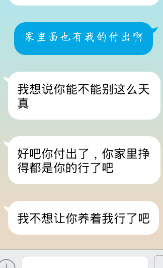 小伙子,努力工作吧,别把老婆给弄丢了,万一把老婆弄丢了你这脸还往哪儿隔?我跟你说,两人关系不要分什么你我,你付出多少不要说出来,说出来就像在记账一样,就像你付出了多少你老婆也要付出多少一样,这样会让你老婆感到很大压力的,会让你老婆感到你很自私,还有别说什么你养她,就好像她欠你的一样,就好像她依赖你一...