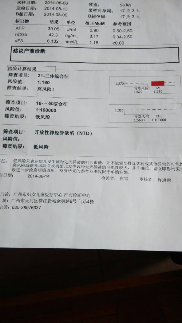 唐筛综合症这样要不要取出羊水检查? 点击展开 匿名用户 2014-09-02 11:08 为您推荐: 其他回答 你好,你的21三体这个还是属于高风险的,所以不能排除胎儿异常的可能性,你可以考虑做个羊水穿刺的 一直在路上yw 2014-09-02 17:29 相关问题 早唐是早期唐氏综合症筛查还是糖筛啊?我错过了没做,今天去医院想做唐氏综合症筛查,直接给开的中期糖筛,也没说要做唐氏综合症筛查,只是预约了四维,到底要不要做唐筛啊 怀孕十六周去做唐筛检查hcg为3 54 21体为95分之一,医生说要去做羊水穿 之前检查羊水指数都是正常的,唐筛,糖耐和大排畸都是正常的,孕38 周羊水指数就变成238了,是不是