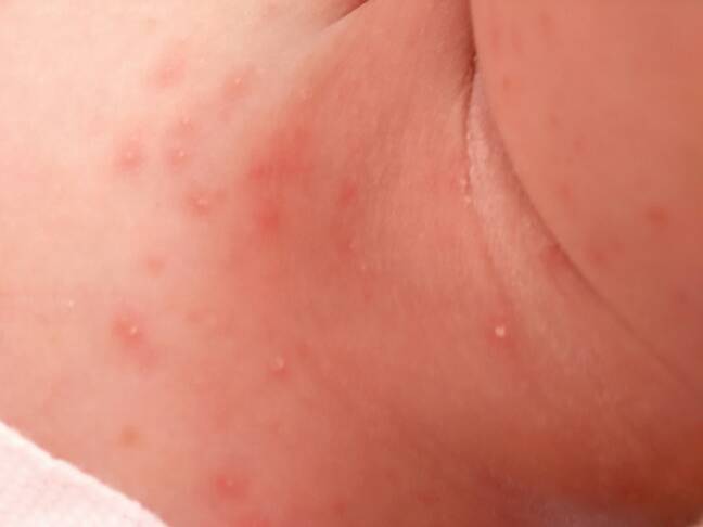 你好,脖子上有,脸上还有身上有吗?宝宝这个是湿疹的,需要注意护理,不要多穿不要热着可以缓解,保持室内空气流通,温水洗澡洗脸,可以抹一些利珍膏。