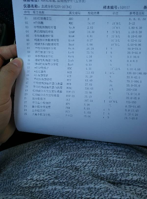 血细胞分析报告单怎么看?10个月的宝宝化验单 点击展开 匿名用户 2016-04-28 13:27 推荐回答 主要看白细胞匪北总数、血红蛋白、红稼局细胞数、血狗刺涉小板数这几个数据,一般后面会有正常范围,可以自己对照一下,其他的数据只要不成倍增高或者减少基本没什么问题 鲜尔雅_kw9b 2016-04-28 13:31 宝宝知道提示您:回答为网友贡献,仅供参考。 相关问题 两月婴儿血细胞分析报告单 男宝5个月 今天早晨拿宝宝臭化验化验单4月是今早 5月是今天下午 宝宝有好转吗?谢谢~如图 17个月宝宝感冒的化验单,麻烦看看怎么样?