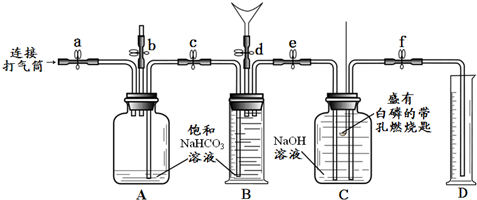 【设计方案并实验】实验I:二氧化碳可使澄清的石灰水变浑浊,所以呼出的气体中含有CO2,集气瓶中石灰水变浑浊;氧气支持燃烧,所以呼出的气体中键毫含有O2,集气瓶中的蜡烛能够继续燃烧;水蒸气遇冷凝结,所以呼出的气体中含有水蒸气,干冷的玻璃片上有水雾.故答案为:实验操作主要实验现象实验结论澄清石灰石变浑浊呼出的气体中含有CO2燃着的蜡烛能够继续燃烧呼出的气体中含有O2干冷的玻璃片上有水雾呼出的之某气体中含有水蒸气实验Ⅱ:(2)实验记录: ③关闭b向A装置中通入气体,则会使A中的液体被压入B装置中,从而使B中的液面上升,而使B中的气体被压入C中,所以在C导管口会发现有气泡冒出,由于气体中含有二氧化碳,所以由于二氧化碳要和氢氧化钠反应,但是大部分气体不会发生反应而滞留在C装置中,将C装置中的液体压入D中; ④白磷燃烧产生大量白烟,放出大量热,反应的方程式是:4P+5O2;点燃;.;2P2O5. ⑤白磷燃烧要消耗氧气,从而会使C装置中的压强变小,而使D中的液体倒吸入C装置中,是C装置中的液面上升;数据处理:根据将气体鼓入C装置后气体体积减少了25mL可以知道该气体为二氧化碳,而白磷燃烧后气体体积剩余了400mL,结合气体的性质可以判断出这400mL气体为氮气,被消耗的体积为75mL,即氧气的体积为75mL,进而可以求出氮气的体积分数为:400mL500mL×100%=80%,氧气的体积分数为:75mL500mL×100%=15%,二氧化碳的体积分数为:25mL500mL100%=5%;【实验反思】(1)根据实验过程中所接触的物质及反应条件可以知道,氮气不能燃烧也不支持燃烧,难溶于水,并且不能和氢氧化钠溶液反应.故选ABCD;(2)如果C装置没有完全冷却即打开止水夹f,则锅殖唤会由于C中温度较高气体受热膨胀,而使D中液体进入到C中减少,D中剩余液体大于400mL,则所测O2的体积分数会偏小.故答案为:【猜想与实践】(2)玻璃片表面有一层水雾实验记录:实验操作主要实验现象实验结论及解释 ①检查装置的气密性.向装置中加入药品.关闭止水夹a~f.\\装置的气密性良好. ②打开b、c、d,向B中吹入一定量气体后关闭d,并冷却到室温.B中液体进入到A中,B中液体减少500mL.收集500mL气体. ③关闭b,打开a、e、f,用打气筒向A中缓缓充气,直到B中气体刚好全部排出.A中液面下降,B中液面上升至最高,C中左侧导管口有气泡产生,且C中液面下降,液体沿导管流入D中,D中液体为475mL.反应的化学方程式为 ;CO2+2NaOH═Na2CO3+H2O. ④关闭e、f,用凸透镜聚光引燃白磷.白磷燃烧,产生大量白烟,放出大量热.4P+5O2;点燃;.;2P2O5. ⑤待白磷熄灭并冷却到室温,打开f.D中液体倒吸入C瓶中,C瓶中液面上升,D中剩余液体为400mL.呼出的气体中含有N2,且氮气的体积分数为80%实验反思(1)ABCD;(2)如果C装置没有完全冷却即打开止水夹f,则会由于C中温度较高气体受热膨胀,而使D中液体进入到C中减少,D中剩余液体大于400mL,则所测O2的体积分数会偏小.