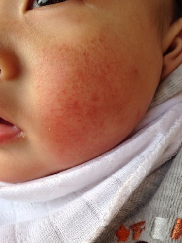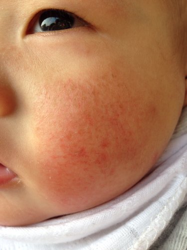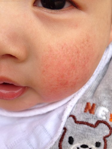 医生好!小宝宝六个月,脸颊两侧红条纹红斑,已经有两个月这样子,用过很多种润肤乳液没有好,请求帮助